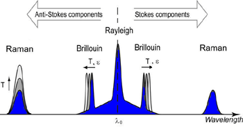 發(fā)現(xiàn)瑞利散射分量與入射光具有相同的波長l 0。有兩個拉曼分量偏移相同的量(斯托克斯分量)和低于l0(反斯托克斯組件)。類似地,布里淵背向散射由兩個在低于和高于l 0的